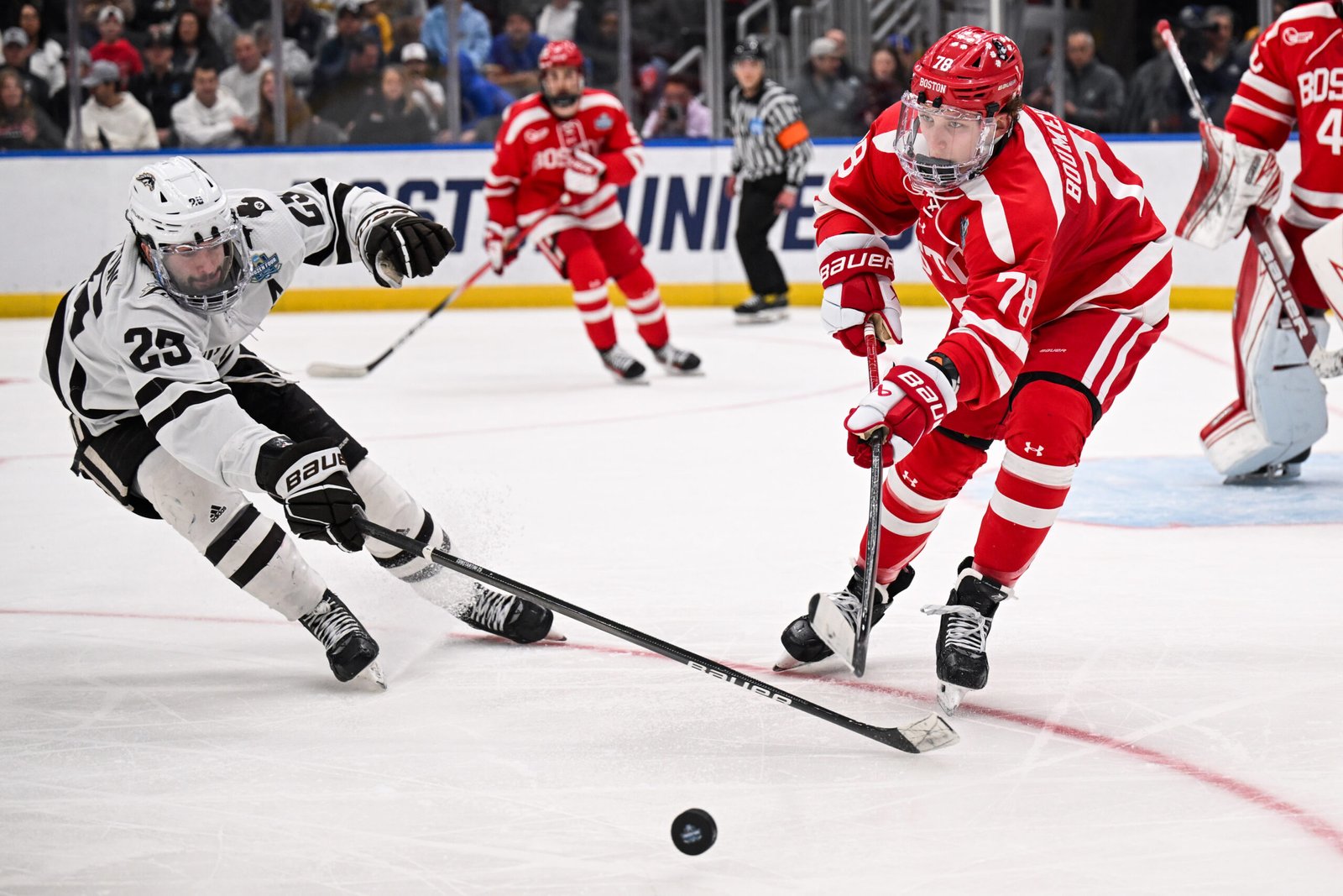 I spent a lot of time watching the NCAA, but more specifically Hockey East this season, so I saw plenty of Boumedienne, and the first thing that stood out to me about him is his skating. While I wouldn’t consider him the most powerful skater, he is a great skater in the sense that he looks like he is moving effortlessly down the ice. Boumedienne uses his skating to join the rush, allowing him to create plenty of offensive opportunities for his teammates.