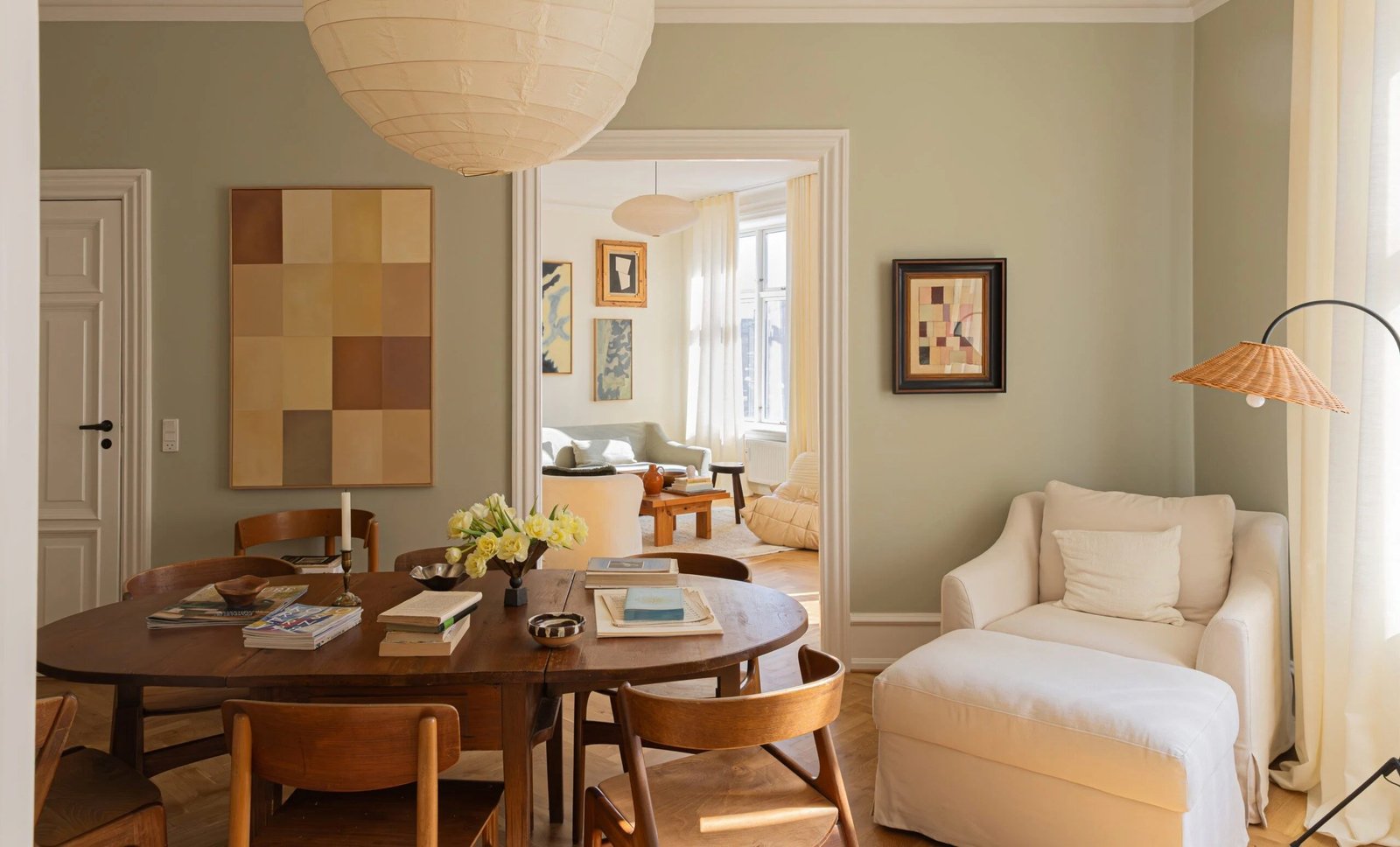 Wall color: 4524 from Flügger. Table, hutch, and floor lamp: vintage. Dining chairs: “Old Kai Kristiansen chairs I found 20 years ago in a vintage shop.” Paintings: Simone Polk. Pendant: vintage, similar. Curtains: &Drape.