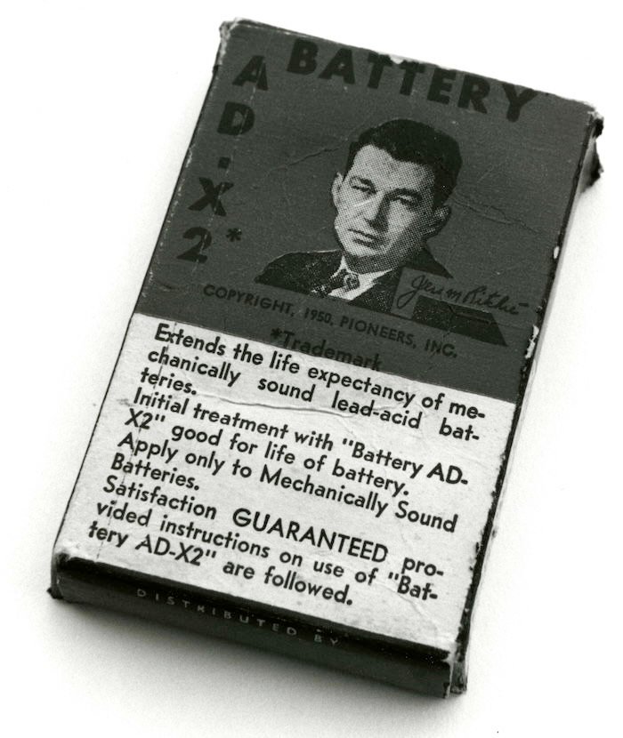 AD-X2, sold by Jess M. Ritchie, a charismatic former bulldozer operator, was a blend of salts designed to be mixed into a car battery’s electrolyte. The lead-acid battery became standard in gasoline-powered cars around 1920 and motorists soon came to know battery trouble as a familiar bugbear. Additives, which purveyors claimed would revive dead batteries or extend the lives of healthy ones, proliferated. The NBS had tested dozens of nostrums of similar composition and repeatedly declared them ineffective, and sometimes harmful. Ritchie, though, remained indefatigable. Declaring NBS condemnations outdated and prejudicial to his product, he mounted a dogged political pressure campaign, asking his distributors to write to their senators, lobbying members of the Senate Small Business Committee, and pleading his case directly to Weeks, who took action.