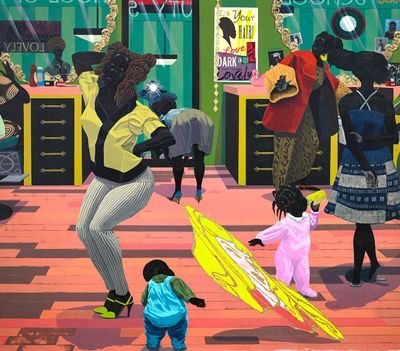 Marshall also scatters mirrors across School of Beauty, School of Culture, a nod to Jan van Eyck’s Arnolfini Portrait(1434) and Diego Velázquez’s Las Meninas (1656), two