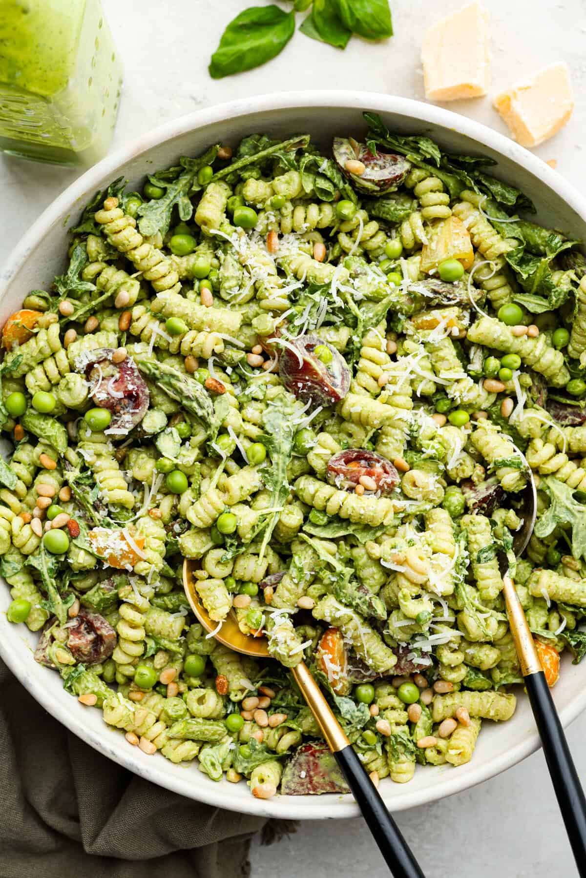 Add 1 pound cooked pasta, 1 pint halved cherry tomatoes, 2 cups arugula, 1 cup shelled sugar snap peas, 1 bunch asparagus, ¼ cup thinly sliced green onions, 1 cup toasted pine nuts, and ½ cup grated parmesan cheese to a large bowl and toss to combine.