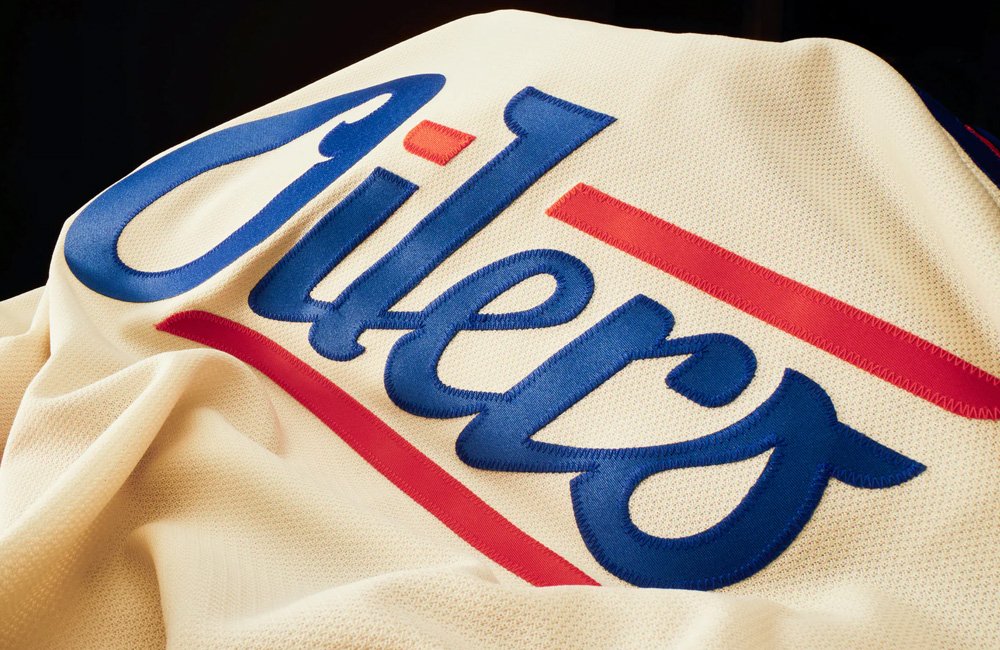 Across the chest is a scripted blue “Oilers” wordmark with orange lines above and below; this is a reference to “nostalgic brands that were trusted to keep machines running smoothly.” The scripted wordmark includes an oil drop inside the “s”.