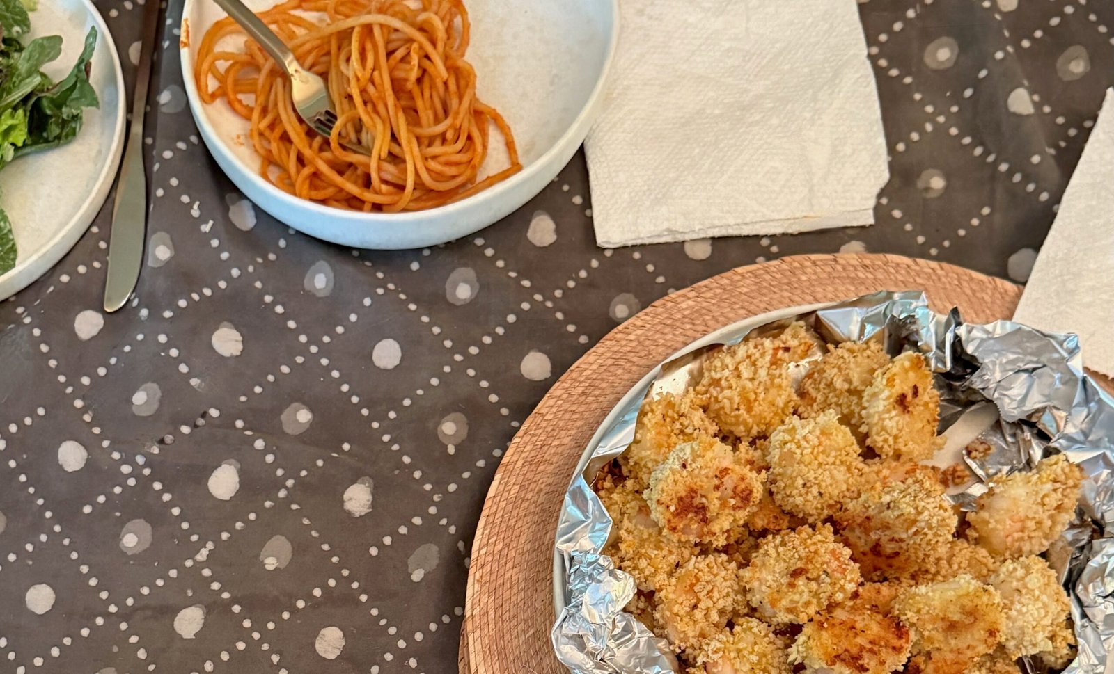 Serve with pasta with tomato sauce and green salad, if you’d like. You can eat the shrimp with the pasta or separately — breaded shrimp and red sauce can be so, so good. Enjoy!