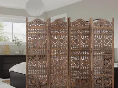 71″ 4-Panel Hand Carved Sun and Mood Room Divider Screen, Brown By Benzara