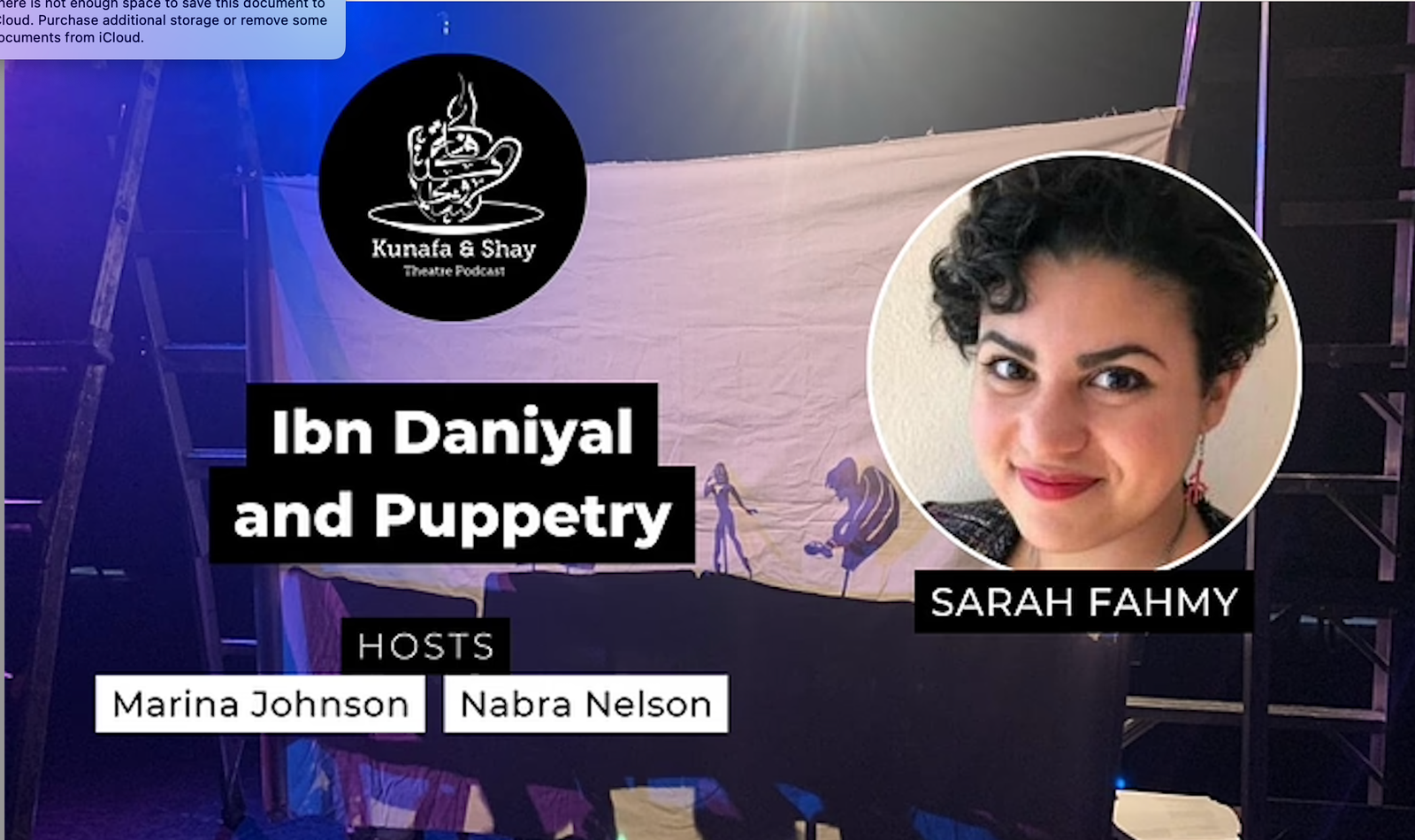 Nabra Nelson: Salam Alaikum. Welcome to Kunafa and Shay, a podcast produced for HowlRound Theatre Commons, a free and open platform for theatremakers worldwide. Kunafa and Shay discusses and analyzes contemporary and historical Middle Eastern and North African, or MENA, and SWANA, or Southwest, Asian North African theatre from across the region.