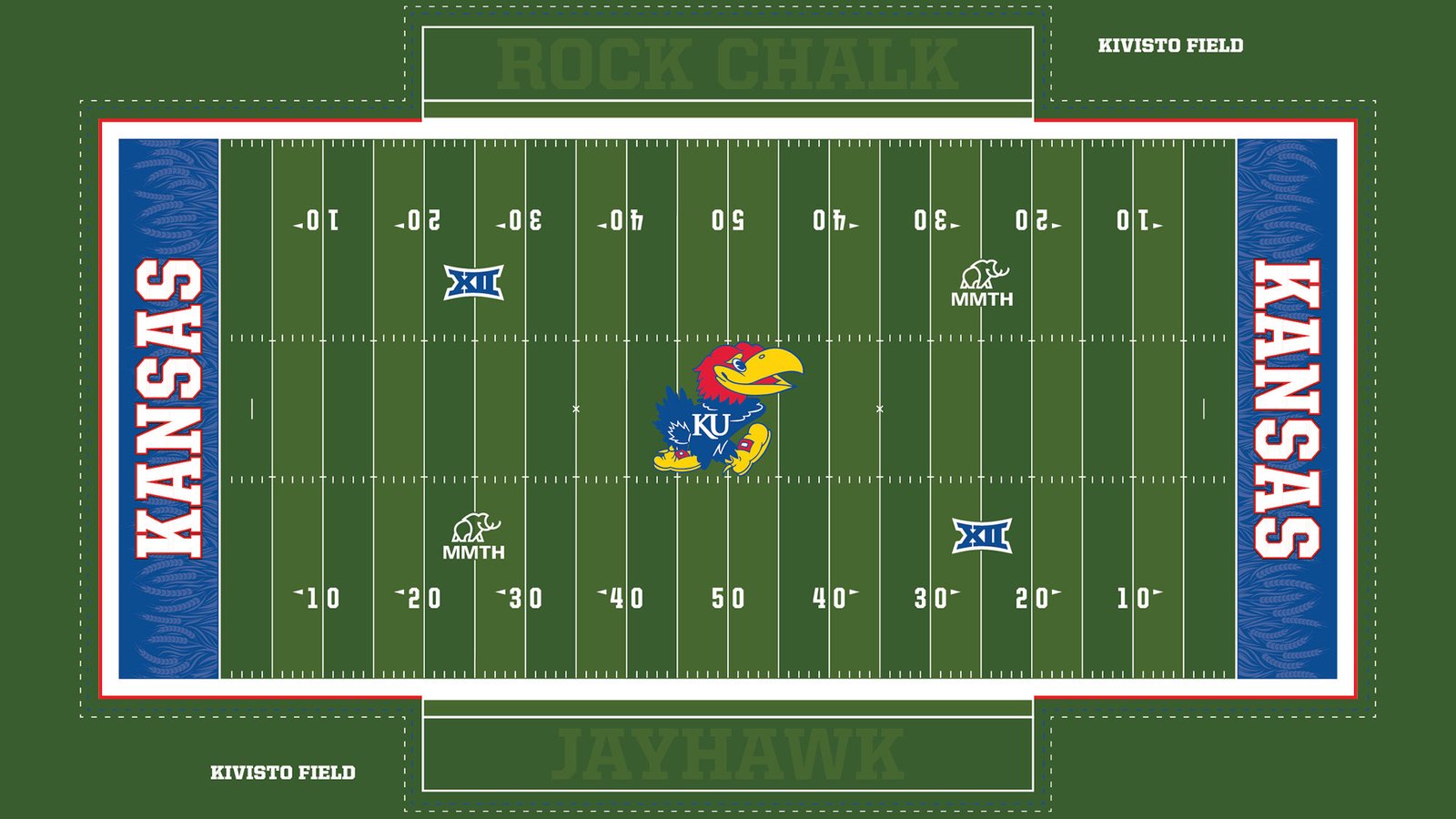 Kansas’ primary logo is displayed at midfield of the new turf, which alternates between a darker and lighter shade of green every five yards. It is accompanied by Big XII logos and advertisements for MMTH, a local sports marketing and construction company, on the 25-yard lines.