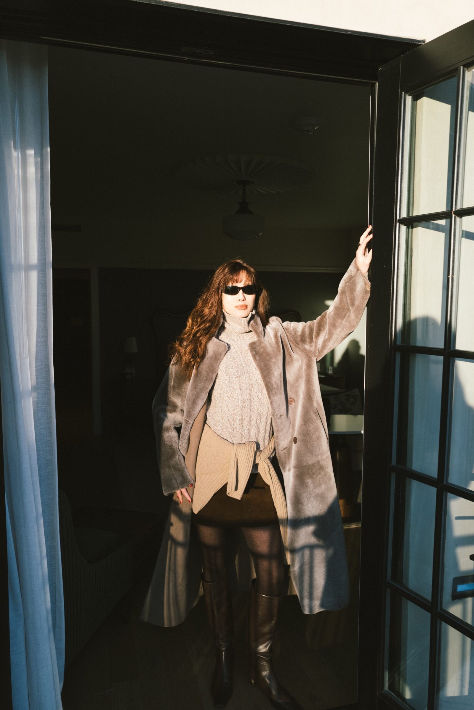 // Linda Farrow sunglasses. HISO shearling coat and (similar). Falconeri turtleneck. Madewell suede skirt. DESTREE silk top and silk pant. Christian Louboutin mule //