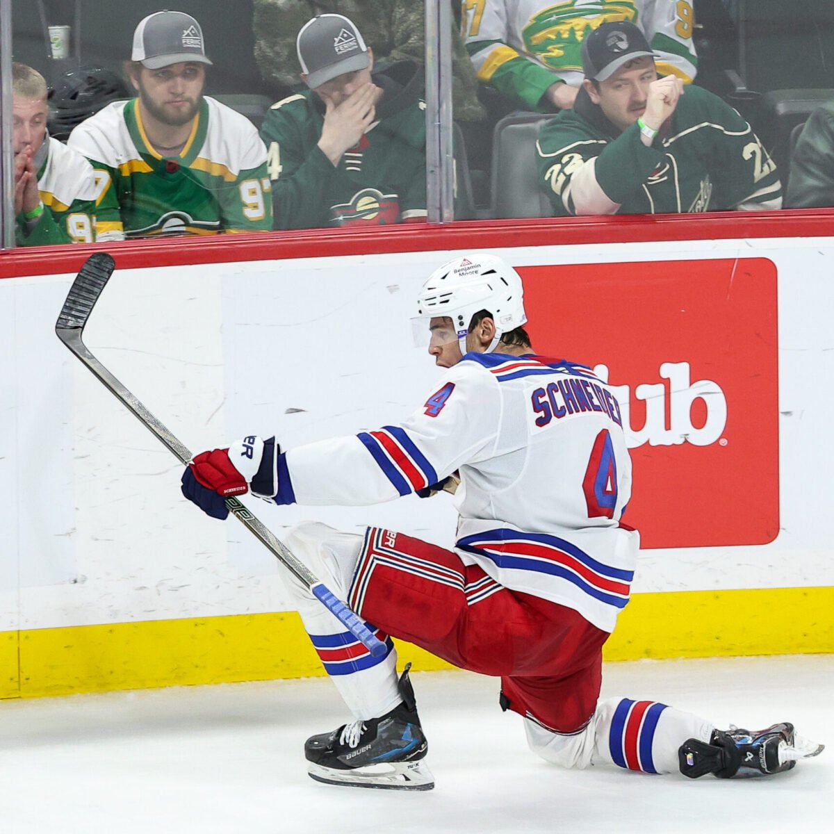 Braden Schneider roofs a backhand over the Minnesota Wild goaltender’s head to win a huge game for the Rangers in OT!