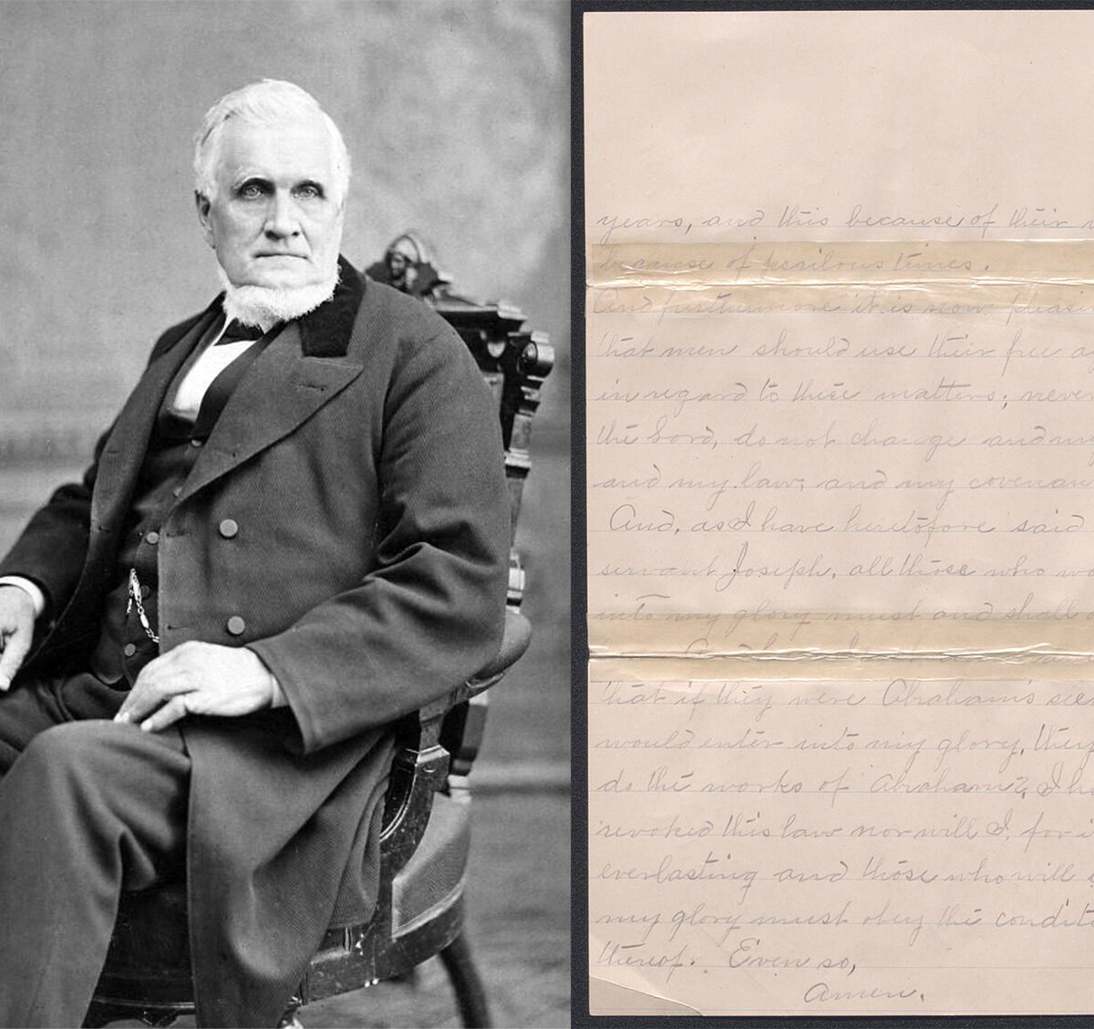 A portion of President John Taylor’s handwritten 1886 revelation declaring that “I, the Lord, do not change and my covenants and my law do not, and as I have heretofore said by my servant Joseph, all those who would enter into my glory must and shall obey my law, and have I not commanded men that if they were Abraham’s seed and would enter into my glory, they must do the works of Abraham? I have not revoked this law, nor will I … ” (Courtesy of the Church History Library, The Church of Jesus Christ of Latter-day Saints)