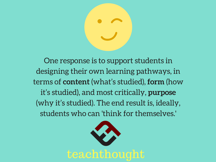 One response is to support students in designing their own learning pathways, in terms of content (what’s studied), form (how it’s studied), and most critically, purpose (why it’s studied). The end result is, ideally, students who can ‘think for themselves.’