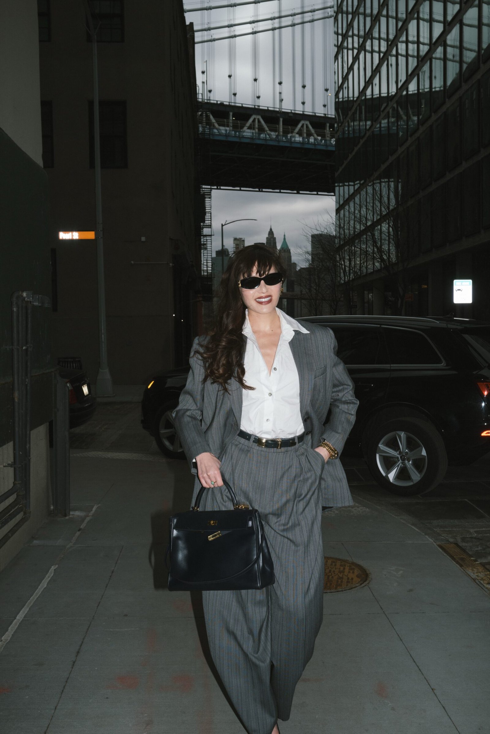// Anine Bing blazer and trouser. Hermès bag. Miu Miu sunglasses //